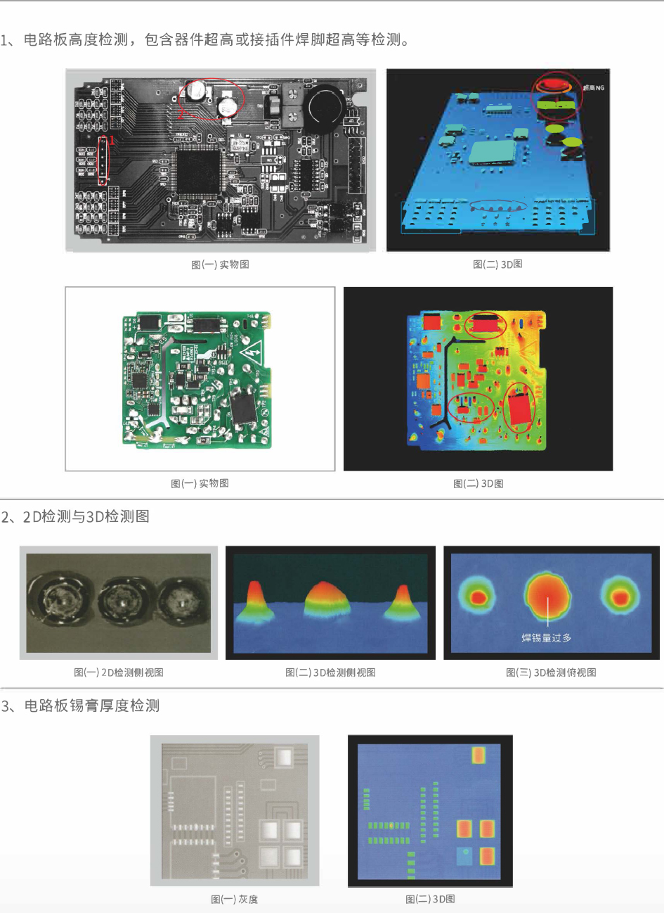 檢測優(yōu)勢 超寬X范圍:對于常見的電路板不需要掃描多次 高動態(tài)范圍:可同時檢測各種材料的高度 快速全檢:單次掃描可同時檢測高度異常。焊錫異常,器件異常等情況。